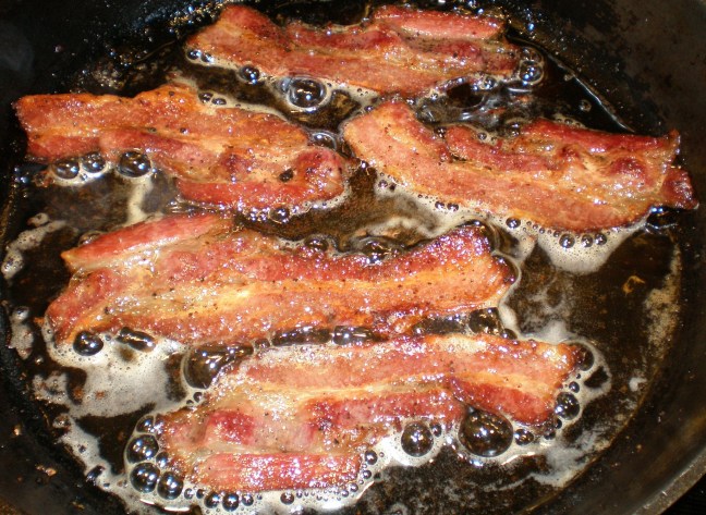 So, bacon is not all bad.  It can be used in moderation for the good of flavor in some dishes.  Just remember no to burn, char, microwave, buy pre-cooked or eat more than a daily allowance in order to not have it be terribly unhealthy for you.  A daily allowance of bacon is basically none considering that one strip is about 68% saturated fat, 30 mg of cholesterol, 190mg of sodium, and has been shown to lower men’s sperm counts.  But, it sure does go well with eggs, burgers, scallops and filet mignon.