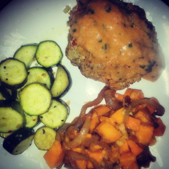 Clean Easter Dinner – Salmon Cakes, Caramelized Cheddar Sweet Potatoes, White Wine Zucchini
