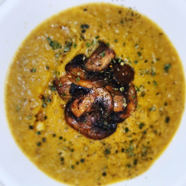 Cheesy Vegetable Soup with Balsamic Sauteed Crimini’s